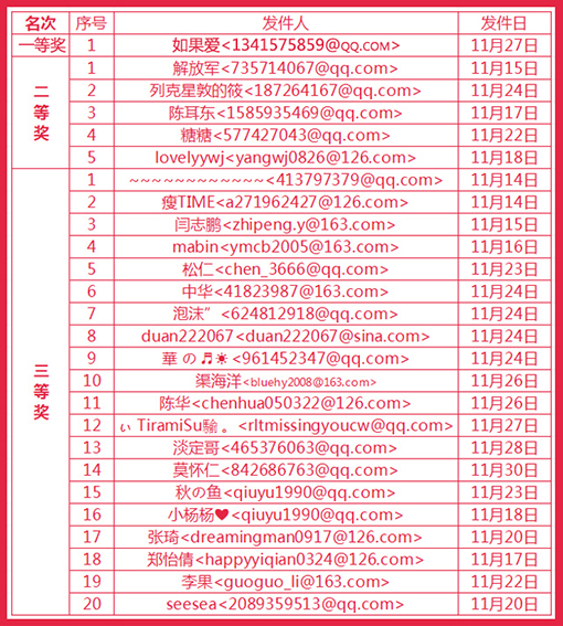 看到本公告后,未發(fā)送過(guò)個(gè)人詳細(xì)信息的中獎(jiǎng)?wù)?,?qǐng)于12月12日前把個(gè)人信息(真實(shí)姓名、詳細(xì)地址、聯(lián)系方式)發(fā)送至郵箱: cxy@china-jado.com ,以便我們能及時(shí)把獎(jiǎng)品寄出,逾期未發(fā)送者視為放棄獎(jiǎng)品。