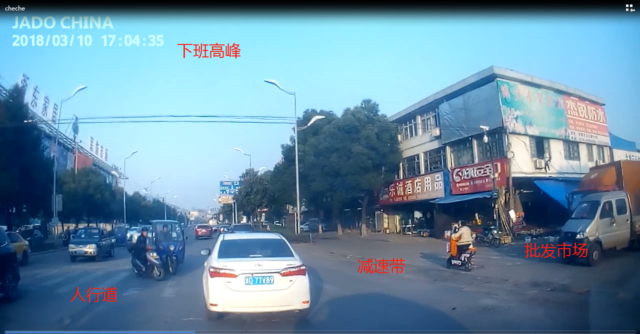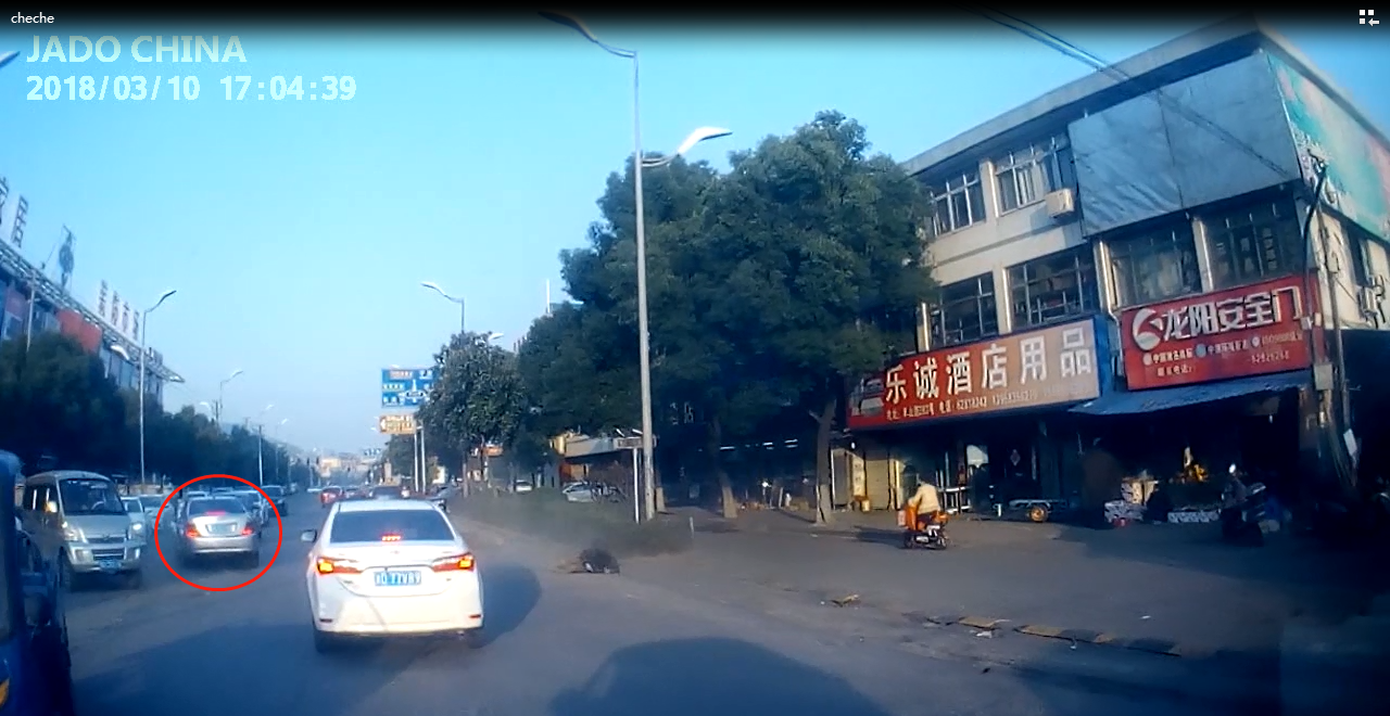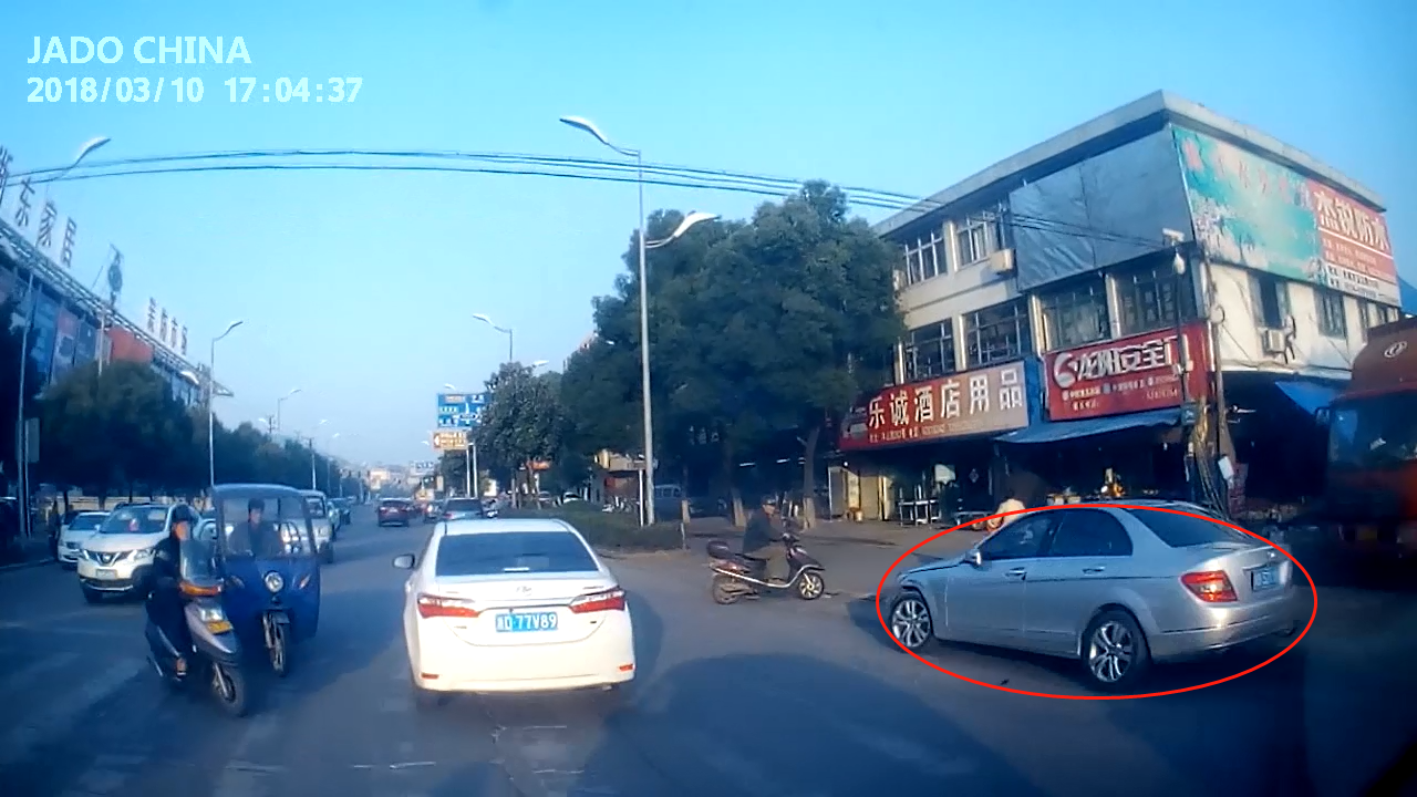 視頻中顯示,一輛銀色汽車迅速地撞向前方橫穿馬路的電瓶車,在急打左轉(zhuǎn)向盤的時(shí)候,沖向反向車道又撞上一輛面包車,造成二次傷害,整個(gè)過程被捷渡車主安裝的D720行車記錄儀記錄了下來。