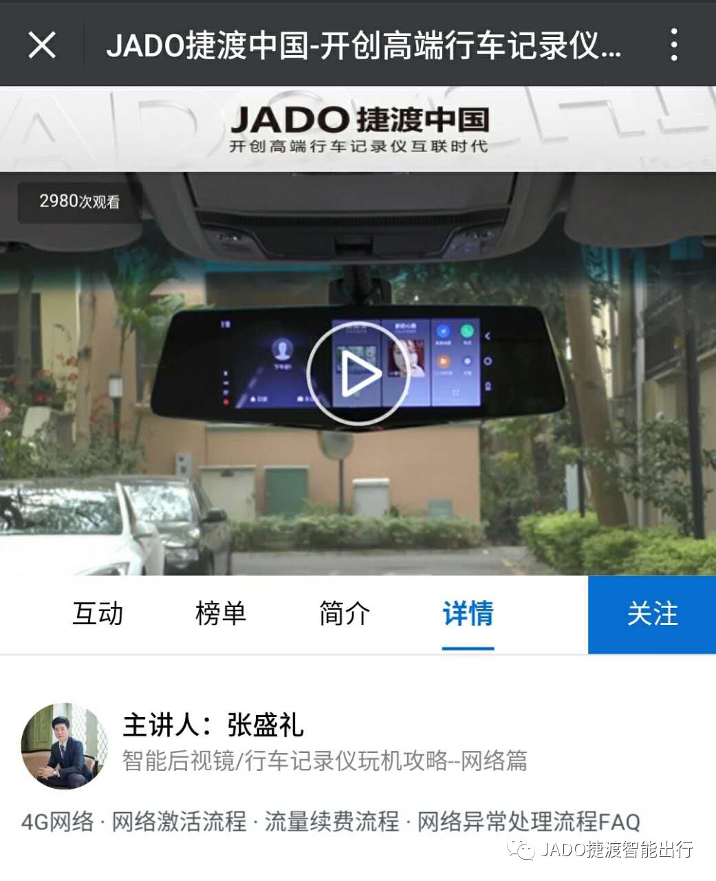直播中,張盛禮先生就網(wǎng)絡(luò)注冊(cè)激活流程進(jìn)行現(xiàn)場(chǎng)演示,使觀眾仿佛置身現(xiàn)場(chǎng),對(duì)于JADO智能行車(chē)記錄儀的使用一目了然,更加得心應(yīng)手。同時(shí)也針對(duì)使用中可能出現(xiàn)的微信公眾號(hào)二維碼加載失敗或者網(wǎng)絡(luò)異常的問(wèn)題,進(jìn)行措施處理的講解。