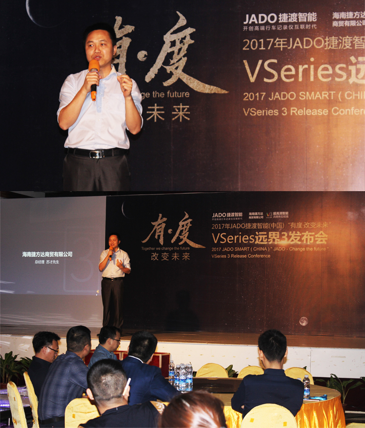 “不忘初心,七年磨一劍!我們迎來(lái)了VSeries遠(yuǎn)界3超高清智能流媒體后視鏡”,JADO捷渡智能(中國(guó))董事長(zhǎng)王杰先生上臺(tái)為大家總結(jié)2017年JADO捷渡智能(中國(guó))所取得的成績(jī),以及2018年JADO捷渡智能(中國(guó))將進(jìn)一步開(kāi)啟“資本化”和“國(guó)際化”。他表示:非常感謝海南省區(qū)各戰(zhàn)略合作伙伴的蒞臨,期待2018大家攜手共創(chuàng)美好未來(lái)。