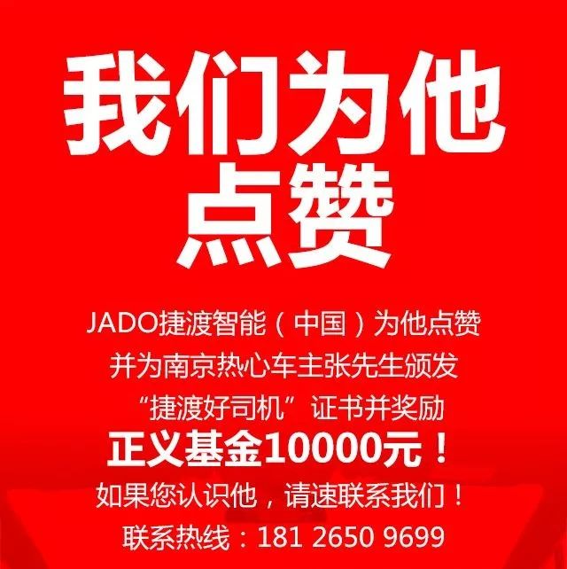 JADO捷渡智能(中國)為提供證據(jù)的張先生點贊,為他的中國心、正義感點贊!同時將為張先生頒布“捷渡好司機”證書,并獎勵正義基金1萬元!
