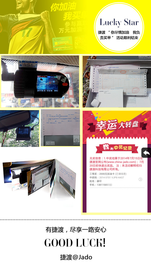 活動(dòng)開始,參與人數(shù)較多,每天都會(huì)有新的獎(jiǎng)項(xiàng)產(chǎn)生,但前三等大獎(jiǎng)卻沒人中,直到6月28日一等獎(jiǎng),才被安徽的一位幸運(yùn)觀眾摘取,價(jià)值12500元的70寸大電視,這位觀眾激動(dòng)地說,這么好的獎(jiǎng)品,準(zhǔn)備留給兒子結(jié)婚用!也許是好運(yùn)連連,7月1日有兩位幸運(yùn)觀眾摘取了三等獎(jiǎng),價(jià)值2000元中石化加油卡。事情常出乎人意料,7月1日以后小獎(jiǎng)是不斷有人中,前三等大獎(jiǎng)卻是一直再?zèng)]有出來,直到活動(dòng)結(jié)束前兩天,即7月12日,浙江余姚的一名姓楊的幸運(yùn)者摘取了二等大獎(jiǎng),價(jià)值10000元加油卡,這位幸運(yùn)者特別開心地給我們打電話來說,我一年的油費(fèi)全省了?。≌娴氖?我盡情加油,捷渡負(fù)責(zé)買單",哈哈......