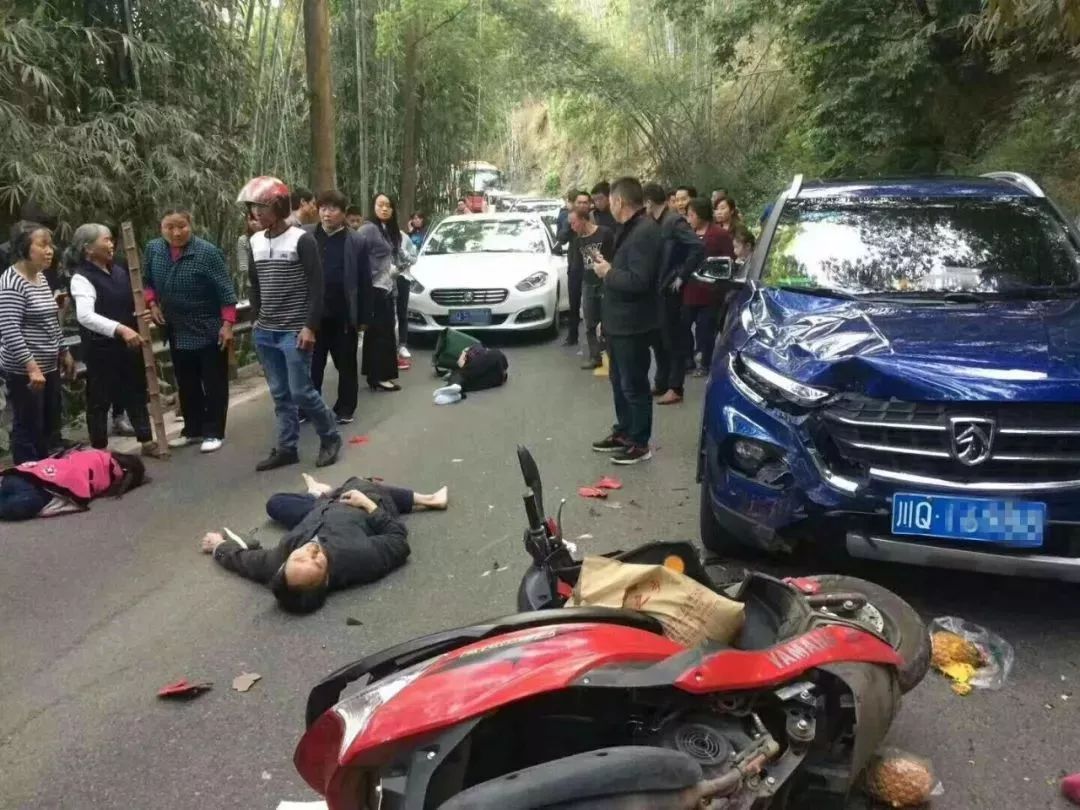據(jù)視頻上的行車記錄儀顯示,事發(fā)路段車流量較大,路面平坦但彎道較多。畫面中一輛搭載三人的兩輪摩托車行駛在安裝有行車記錄儀的汽車前方。當摩托車行駛至一塊寫有“三中隊”的交通指示牌下, 對面一輛藍色寶駿汽車(車牌川Q169**)突然越過中間線超車,與摩托車發(fā)生猛烈撞擊,摩托車上三名駕乘人員當即飛出,摔在公路上。
