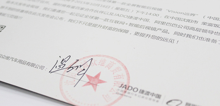 2015年10月16日,以 “改變成就未來(lái)” 為主題的“JADO捷渡中國(guó)智能后視鏡遠(yuǎn)界系列(中國(guó).遼寧)發(fā)布會(huì)暨戰(zhàn)略合作簽約儀式”,在中國(guó)沈陽(yáng)榮富大酒店完美落幕。