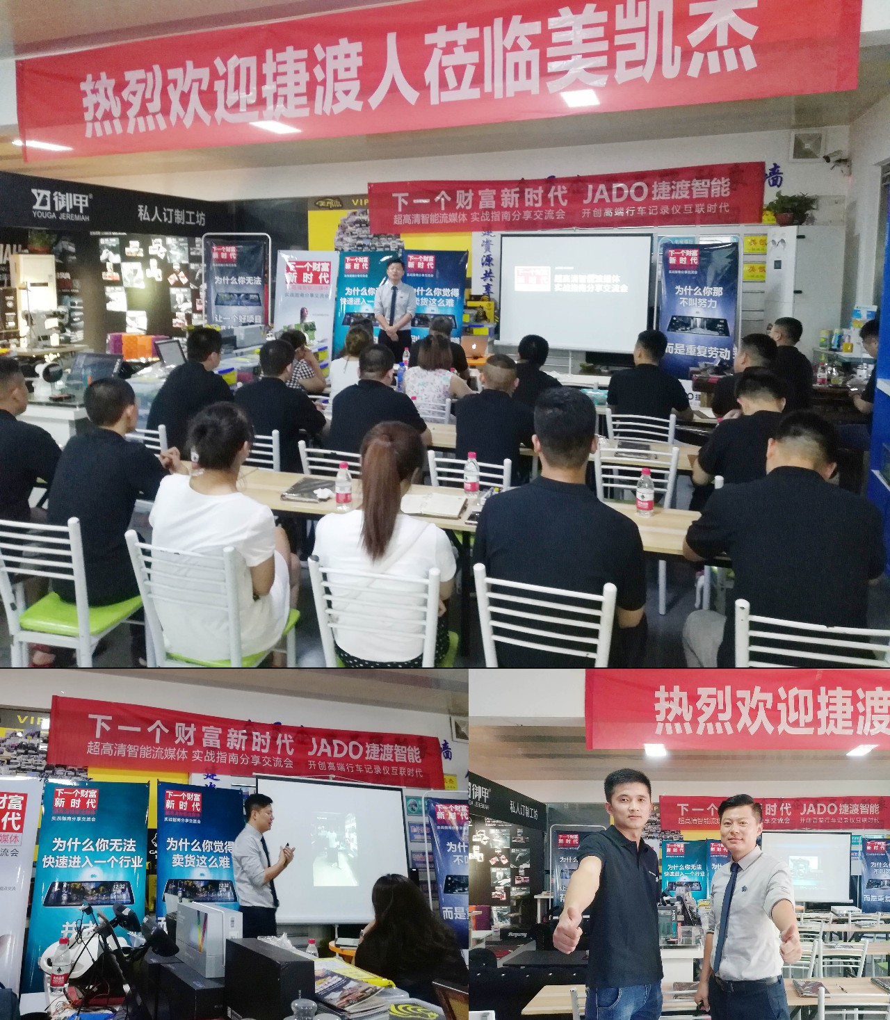 會中,JADO捷渡智能(中國)戰(zhàn)區(qū)負(fù)責(zé)人杜新先生為大家介紹了流媒體后視鏡,擁有最新的AliOS3.0系統(tǒng),首創(chuàng)全面屏流媒體后視鏡,超高清航天級夜視,主動行車安全系統(tǒng)等。并分享了超高清智能流媒體后視鏡產(chǎn)品的銷售技巧,講解了產(chǎn)品在未來的發(fā)展空間和趨勢。并通過對目前全國一些優(yōu)秀終端店的成功經(jīng)驗的總結(jié),以及不同區(qū)域的市場特點的分析,讓現(xiàn)場的運營商在產(chǎn)品信息、思路拓展以及客戶交流等方面都收獲頗豐。