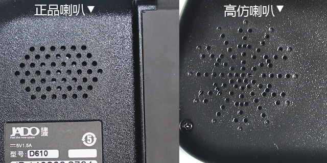 4、 看喇叭孔:正品捷渡 D610 是規(guī)矩的六角形;高仿 D610 日喇叭孔,是放射的"米"字形,也比正品捷渡 D610 花哨點(diǎn)。讓圖說話:
