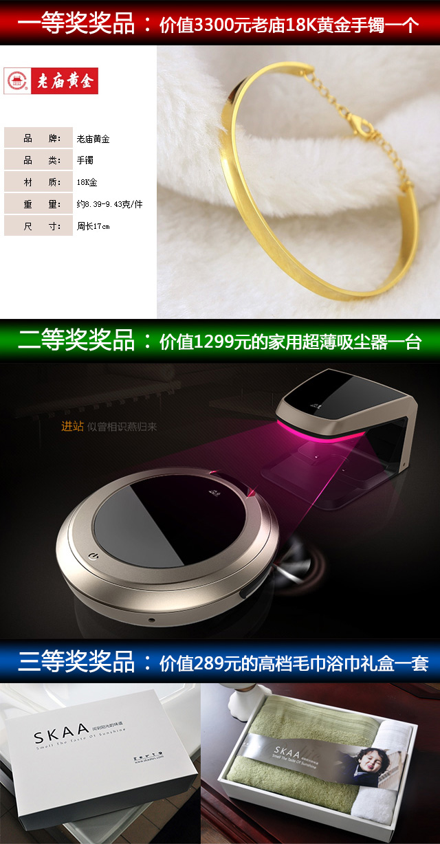 【活動獎品】:一等獎:1名。價值3300元的老廟18K黃金手鐲。